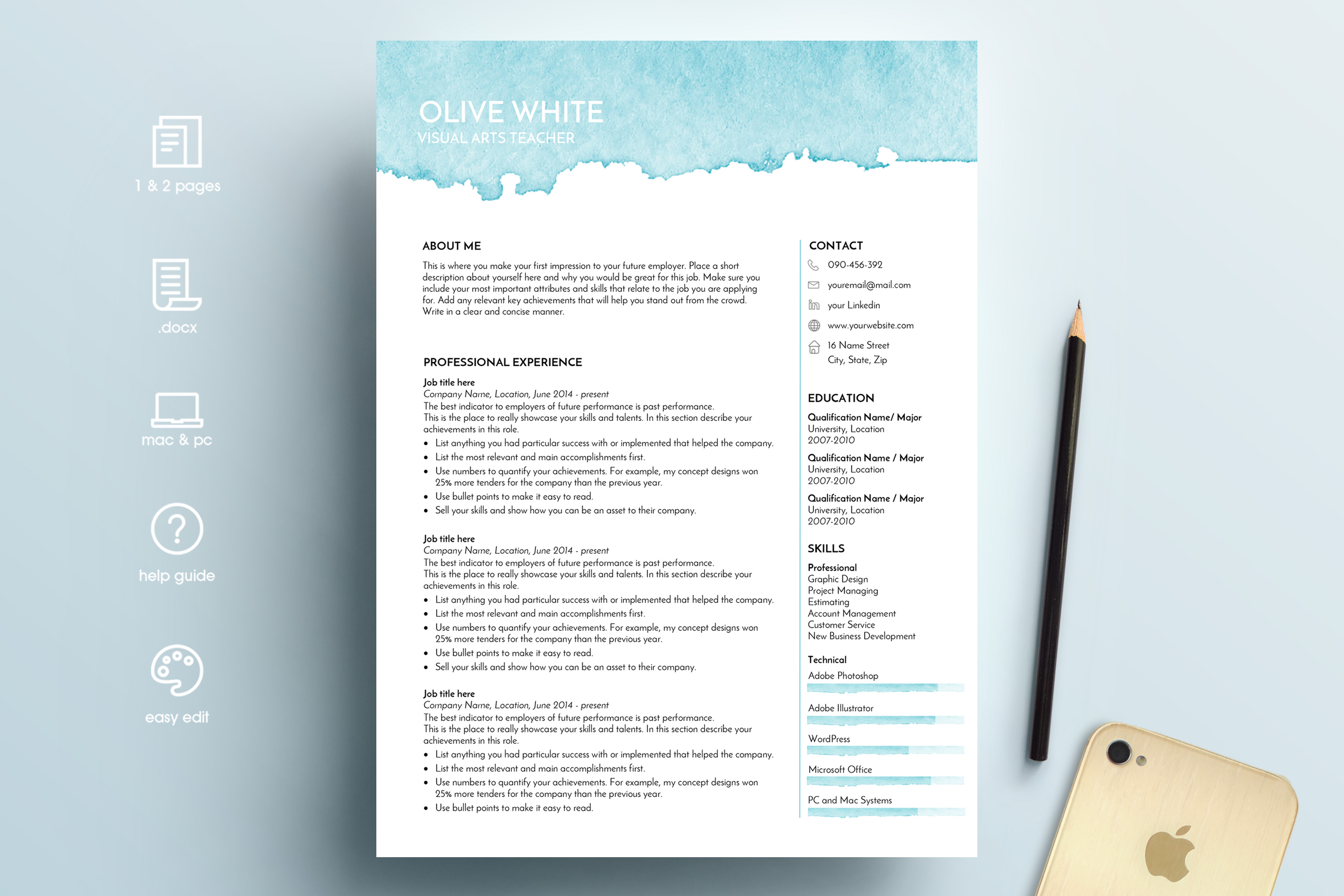 Resume Template Word Blue Watercolor